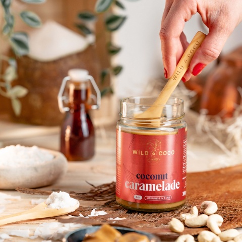 Caramelartiger Kokosaufstrich. Das süßeste all unserer Produkte. Am besten mit Nussmus aufs Brot, zu Pancakes, mit Porridge oder Granola oder in Rohkostgebäcken und Nachtischen als Karamell-Alternative.