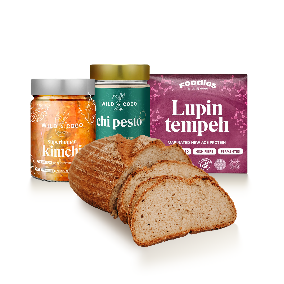 Enthalten sind: Proteinbrot, Chi Pesto, Kimchi und Lupinen-Tempeh. Ideal für Arbeit, Reisen oder als leichtere Alternative zum Mittagessen – wenn Sie satt sein wollen, ohne sich schwer zu fühlen.